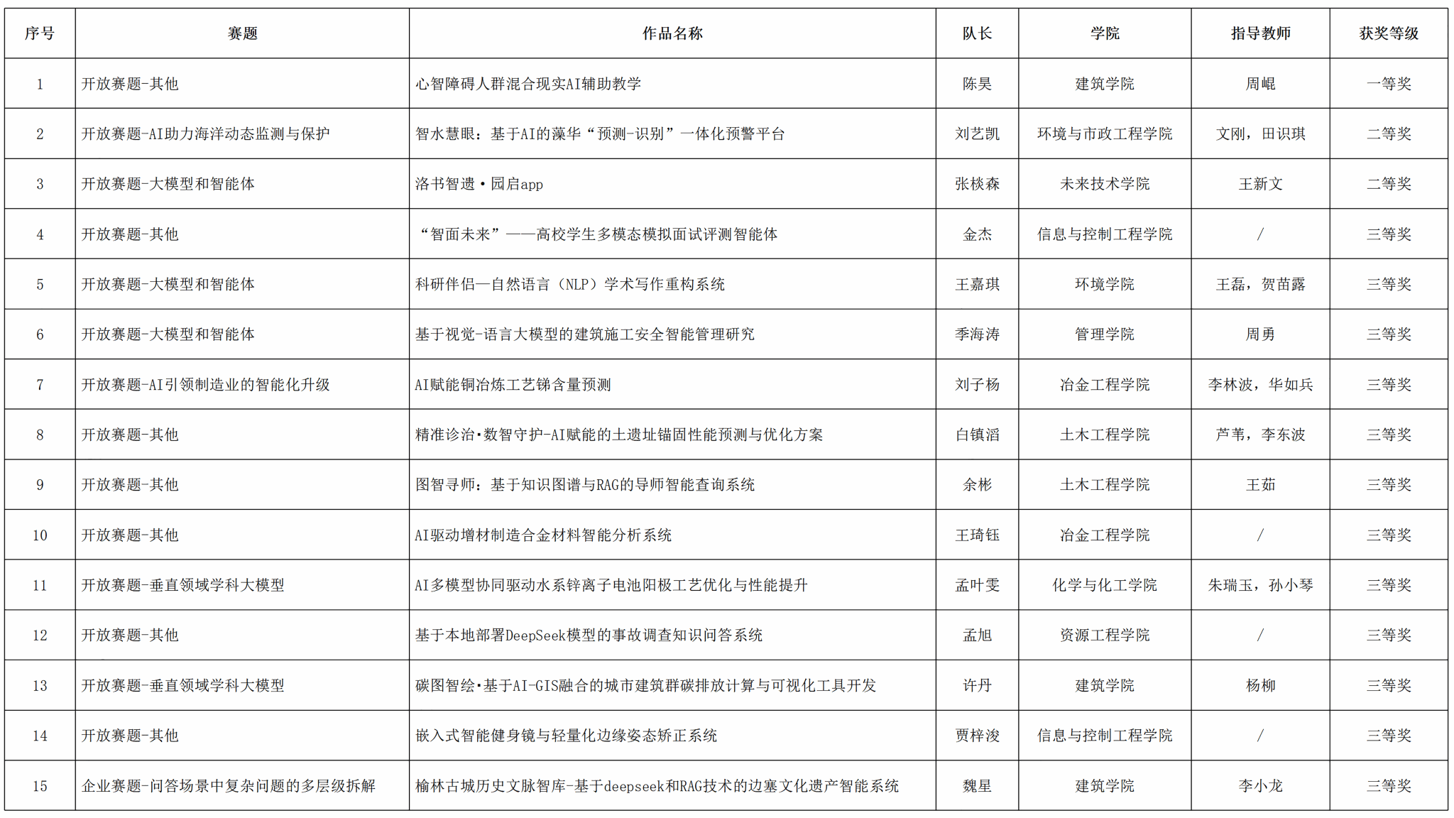 研究生院、党委研究生工作部积极组织学生备赛,在我校研究生AI素养大赛的基础上选拔出78支队伍参加国赛,构建了“校赛选拔—专项培训—决赛打磨”的全流程培育体系。参赛学子们立足我校在建筑、土木、环境等学科领域的优势,将人工智能技术与行业实际需求深度融合,充分展示了我校研究生扎实的专业素养和解决实际问题的能力。