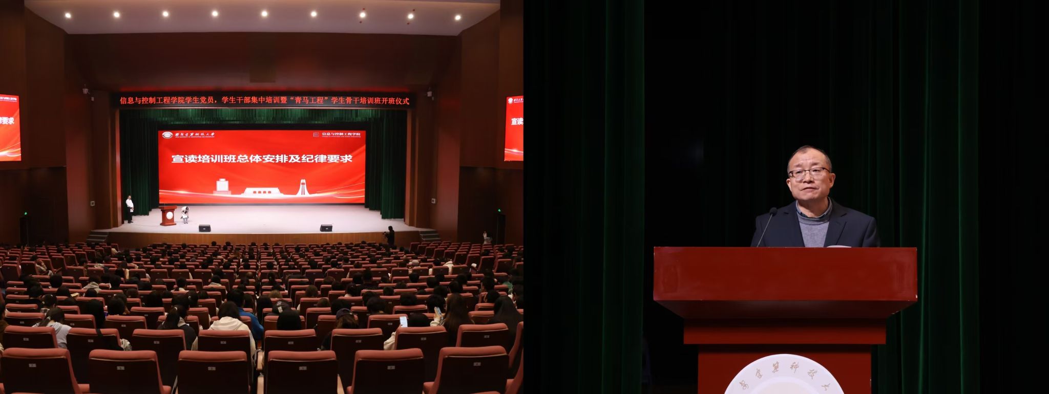 建大新闻网讯 11月5日,信息与控制工程学院在草堂校区紫阁大礼堂举行学生党员、学生干部集中培训暨“青马工程”学生骨干培训班开班仪式。学院党委书记于军琪,党委副书记、副院长米泽龙,学生工作办公室主任顾欣,团委副书记赵莎,各年级辅导员以及本期培训班全体学员参加。开班仪式由学院团委书记杨晓寒主持。