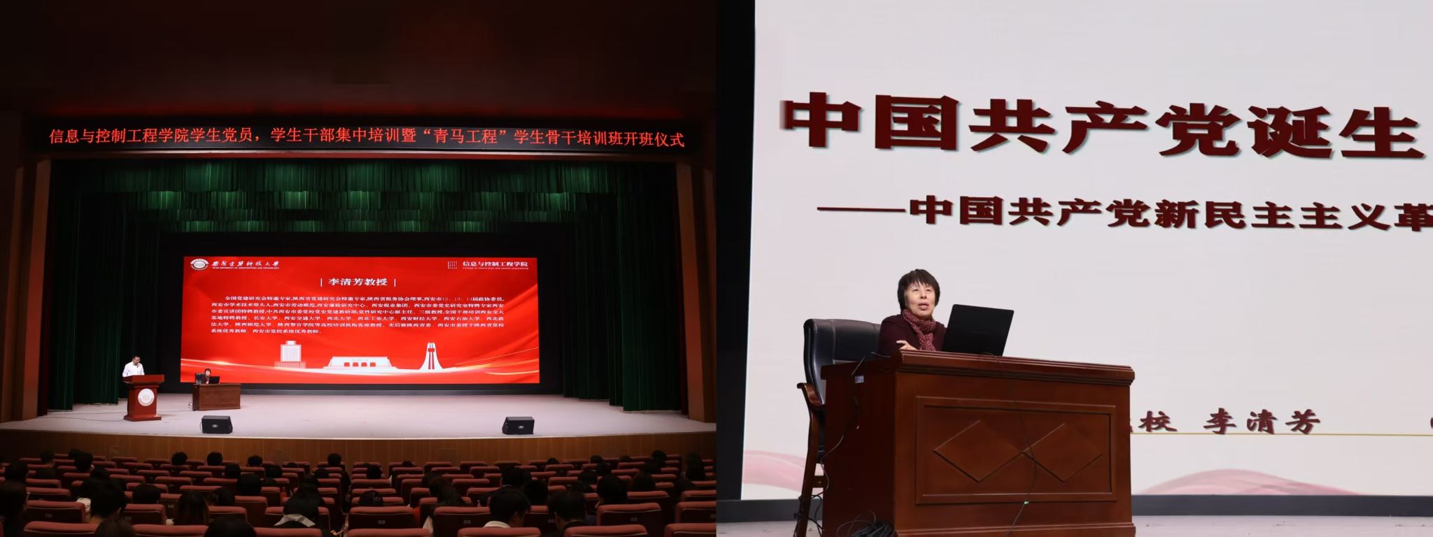 开班仪式结束后,信息与控制工程学院特邀中共西安市委党校党史党建教研部、党性研究中心原主任、三级教授李清芳作题为“中国共产党诞生与新中国成立”专题讲座。她以真实历史脉络为主线,带领全体学员重温了中国共产党的诞生与发展历程,回顾了中国共产党带领全国各族人民取得新民主主义革命完全胜利艰苦卓绝的奋斗过程,让学员们深刻理解“没有共产党就没有新中国”的深刻内涵。