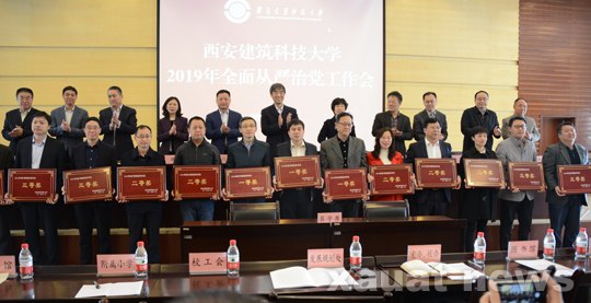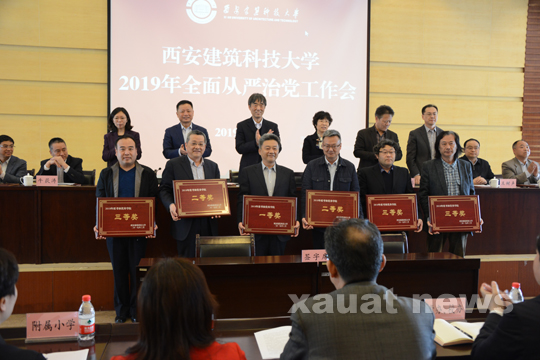 党委副书记马川鑫宣读了学校获得2018年陕西省高校“平安校园”称号的表彰文件。校党委副书记张志昌宣读《关于表彰2018年度考核优秀单位的通知》,与会校领导为获表彰单位颁发了奖牌。