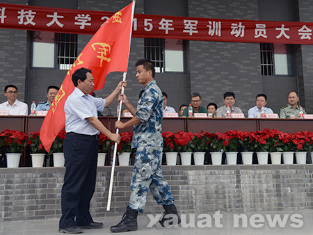 在升国旗仪式结束后,校党委副书记李虎成代表学校向军训团授旗。军训团团长崔明军宣读了军训实施方案。为确保此次军训的组织领导,军训团实行团、营、连三级领导体制,下设10个营52个连,分两个校区同时对2014级全体本科生进行军事训练。军训日期为9月7号至9月27号。训练内容包括军事理论和军事技能,其中理论课学习以营为单位组织,由营值班员向授课教官报告;操场训练以连为单位组织,由连值班员向营值班员汇报,军训团组织到各营巡视检查。军训期间,每天召开营、连长碰头会,了解掌握训练进度,协调有关训练事宜。每天组织一次晚点名,讲评当天训练中的好人好事、存在的问题、传达团里有关指示精神、提出次日军训有关要求。每天召开一次班务会,讲评当日训练及生活管理情况,安排次日训练内容,组织值日员交接班。