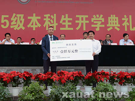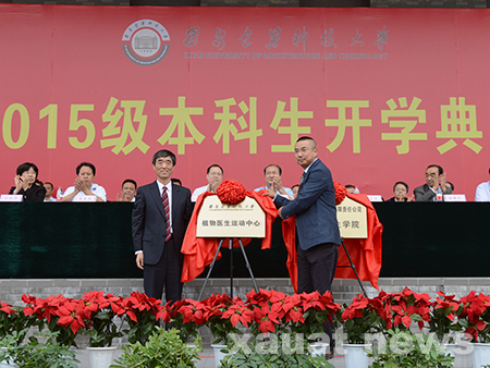 开学典礼上,校友解勇一次性为母校捐赠1000万元,冠名运动中心并设立教育基金,助力母校教育事业发展。校党委书记高明章向解勇颁发了“教育贡献奖”。校长苏三庆与解勇校友一同为新冠名的“植物医生运动中心”和设立的“植物医生学院”揭牌。副校长邵必林代表学校接受捐赠。