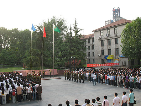 今年是五四运动90周年,为纪念这个特殊的时刻,5月4日清晨,校团委、校学生会、社团联合会及各院系大一和大二的学生代表齐聚图书馆广场,共同参加庄严的升国旗仪式。