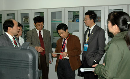 专家组组长钱仁根教授、秘书吕楠检查机电学院机械基础实验室