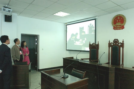 专家组组长钱仁根教授、秘书吕楠检查人文学院模拟法庭