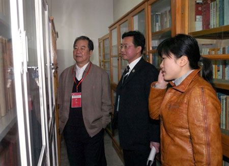 专家组组长钱仁根教授、秘书吕楠检查人文学院图书资料室