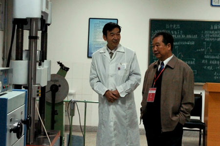专家组组长钱仁根教授察看理学院拉伸压缩实验室