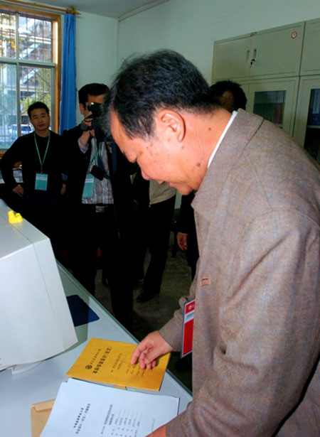 专家组组长钱仁根教授查阅体育系学生毕业论文