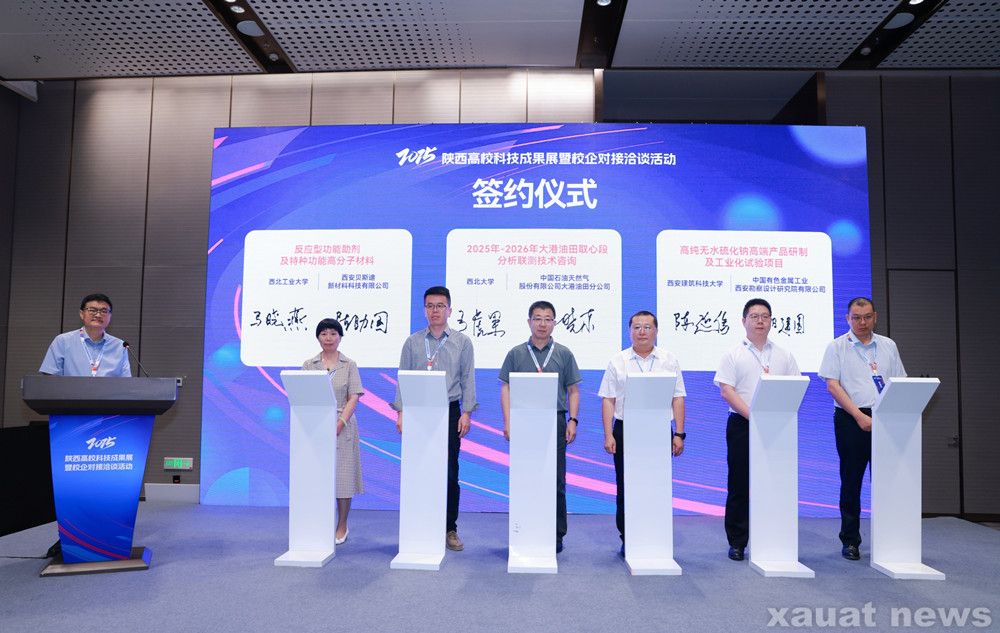 高校科技成果展部分,我校结合自身学科优势和专业特色,通过实物、模型、展板等形式,全方位展现了学校的科学研究实力和技术创新水平。我校作为陕西高校科技成果转化项目代表上台签约,与中国有色金属工业西安勘察设计研究院有限公司签订“高纯无水硫化钠高端产品研制及工业化试验项目”,项目总金额达2196万元。