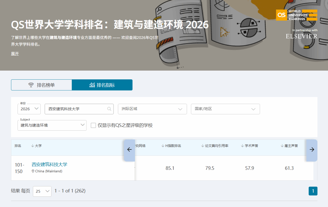 建大新闻网讯 3月25日,国际知名高等教育研究机构QS(Quacquarelli Symonds)发布了2026年QS世界大学学科排名。我校建筑与建造环境学科居全球第138位,较2025年上升52位。此次排名,共有4所在陕高校的10个学科入围全球前150名,陕西省属高校入围全球前150名的有我校建筑与建造环境学科和西北大学的考古学两个学科。