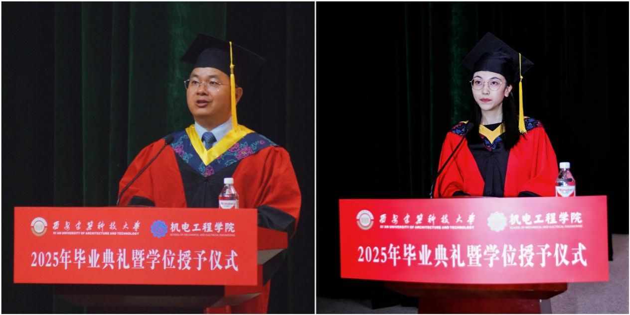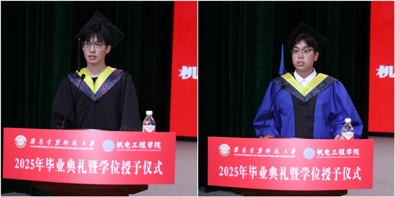 毕业研究生代表机械专业2022级硕士生李晨光,毕业本科生代表机械设计制造及其自动化专业2101班吴翔宇分别发言,表达了对母校、学院的衷心感谢,并祝愿全体毕业生未来之路繁花似锦,星河长明。