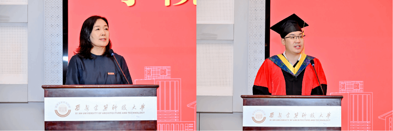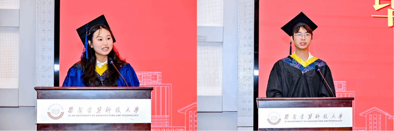 暖通2201班田雪、智能2103班李佳荣分别作为研究生和本科生毕业生代表依次发言。