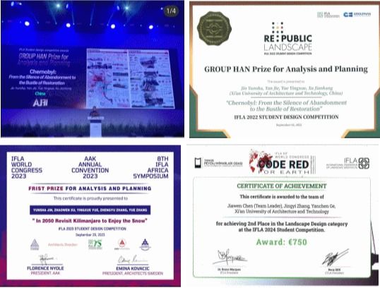 团队成员指导学生蝉联2022、2023年国际风景园林师联合会IFLA大学生设计竞赛规划与分析类第一名、2024年国际风景园林师联合会IFLA大学生设计竞赛景观设计类第二名及组委会特别奖1项。