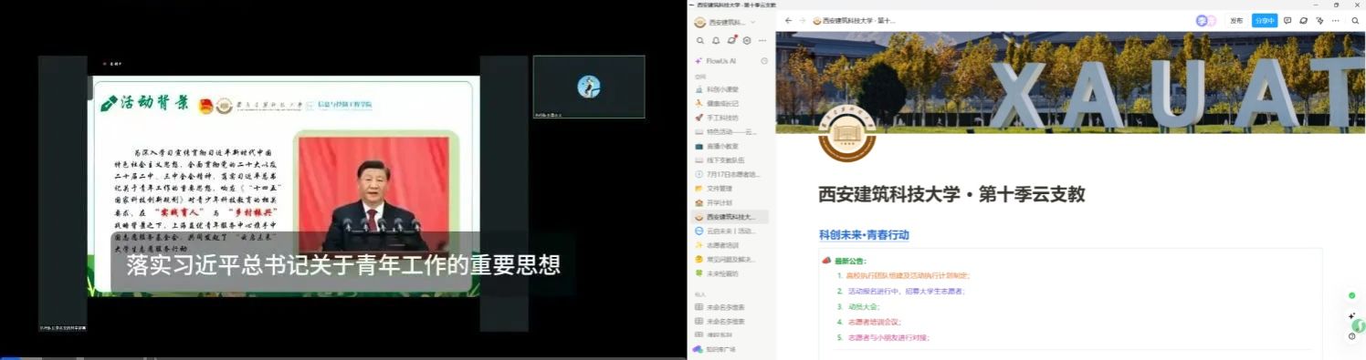 2025年盛夏,当蝉鸣再次回荡在建大校园,我作为西安建筑科技大学信息与控制工程学院“科创未来•青春行动”2025年暑假志愿服务云启未来专项活动的负责人,和实践团队成员共同架设“云端”支教的桥梁,在一次次敲击代码和屏幕那端的乡音交织中让我明白:这不仅是实践,更是用数字架起的教育桥梁,深夜调试的星光与云端课堂的笑声,都让我的青春在奉献中愈发闪亮。政策指引,在乡村振兴蓝图下播种希望。“乡村振兴,教育先行”从来不是一句口号。《乡村全面振兴规划(2024—2027年)》明确提出“推进城乡教育一体化发展”,《关于加快推进乡村人才振兴的意见》也指出“人才支撑的强化必然依赖于教育根基的夯实”。在前期调研中,我们发现许多乡村孩子由于教育资源的匮乏,对编程、自动化等信息科技知之甚少,艺术启蒙资源也相对匮乏。城乡教育资源的鸿沟,像一道无形的墙,限制着孩子们的视野。正是响应这些政策导向,结合调研实际,我们组建了本次“云端架桥”实践团,设计了科创小课堂、未来绘画坊等课程,希望让乡村孩子也能触摸到科技与艺术的温度,只为让乡村孩子知道:科技与创意,同样属于他们。三年坚守,跨专业凝聚支教力量。从2023年开始,我便开始参加“一起云支教,携手创未来”暑期社会实践专项活动,3年来,本团队累计参与志愿者达到1500余人,作为荣获全国大学生“返家乡”云支教活动“双优高校”称号的团队,我们始终记得“用专业所长架起城乡教育桥梁”的初心。而今年,这份责任因我的角色转变而更显厚重——从往年的普通志愿者到今年的“科创未来·青春行动”暑假志愿服务云启未来专项活动的团队负责人,我深知肩上扛着的不仅是责任,更是前辈们传递的接力棒。每当看到新队员眼中闪烁的热情,就像看到当年的自己——这份代代相传的“传帮带”精神,使得云支教的初心愈发坚定。