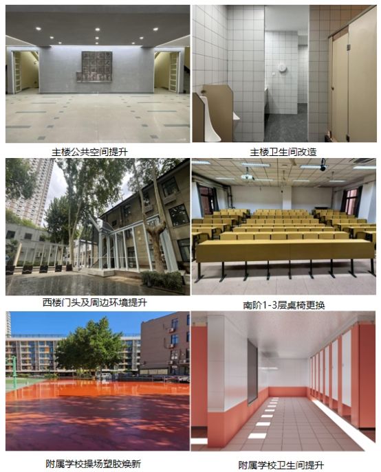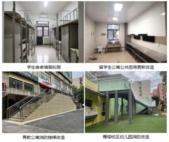 暑期统筹推进教学科研场所焕新、学生公寓环境提升、基础设施维修、消防安全改造等四大类共48项校园修缮改造项目,全方位提升校园环境服务保障水平。一是实施雁塔校区主楼公共空间提升和卫生间改造、南阶1-3层桌椅更换、附属学校楼宇加固及操场翻新等项目。二是完成两校区908间学生公寓环境提升,粉刷墙面89000㎡,更换门窗286套、灯具293套等。三是完成雁塔校区实训大楼国重实验室电力升级、北院东侧围墙砌筑、草堂校区公共楼宇外墙瓷砖维修、学生活动中心北侧广场和综合楼东侧人行道约1100m²室外地面修补等项目。四是有序推进附属幼儿园和青教公寓北侧室外楼梯消防改造。