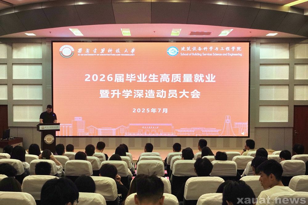 建大新闻网讯 为助力2026届毕业生明晰就业升学形势,精准把握职场机遇与深造路径,7月2日,建筑设备科学与工程学院在雁塔校区工科楼一楼报告厅召开2026届毕业生高质量就业升学动员大会暨“职”说就业育人活动。我校2001级校友、中芯志净建设(西安)有限公司总经理杨正午、悠然海外创始人袁旭,学院党委书记王云玲,党委副书记、副院长叶磊等出席会议。